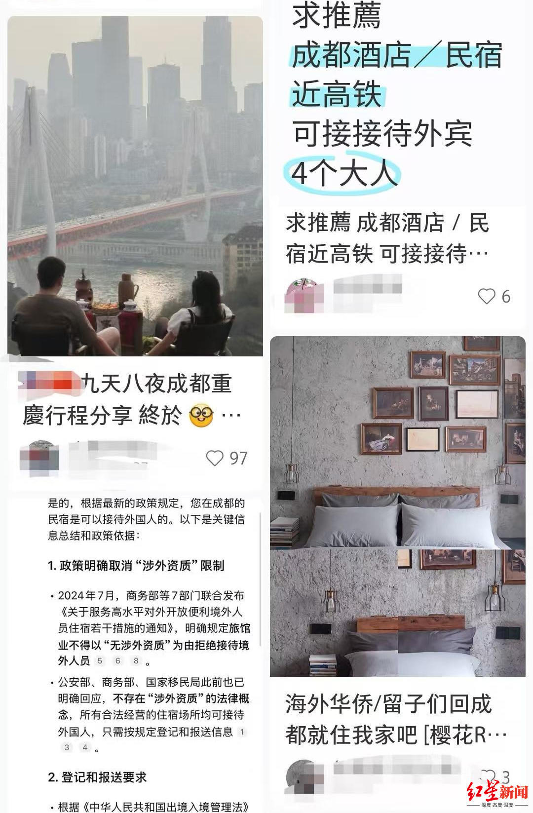 据了解,这些选择自由行的外国游客,往往首选在成都的民宿,而非成都的酒店。在小红书上,有不少关于外国人的求助帖,如“求推荐在高铁站附近的民宿,可接待外宾,共4人出行”“外国人在成都办理民宿入住需要哪些手续”……来自新加坡的Jerry是一名背包客,8月12日左右,他刚结束在贵阳的旅行,“中国的APP非常强大,在这里几乎能找到我想要的全部内容,尤其是旅行攻略。”